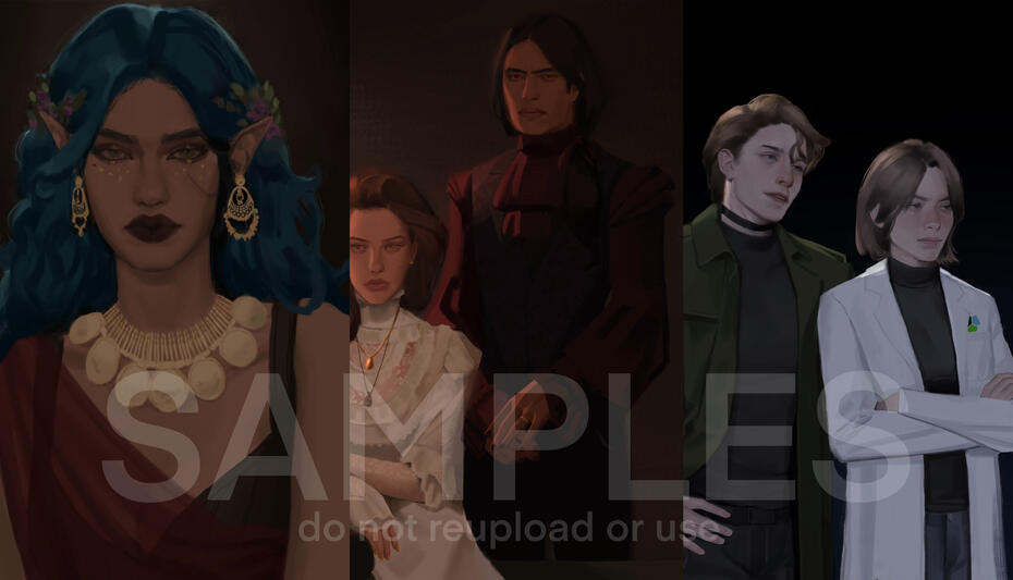A full render includes detailed work not only on the face but also on all the costume elements. I do my best to render everything as thoroughly as I can, while allowing for less detail in areas that are not the main focus (such as small background elements, for example). This option also allows for a more complex background, but I can’t guarantee that I’ll be able to bring every idea to life exactly as you imagine it. Below you can see this demonstrated in my personal works and completed commissions.